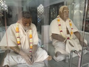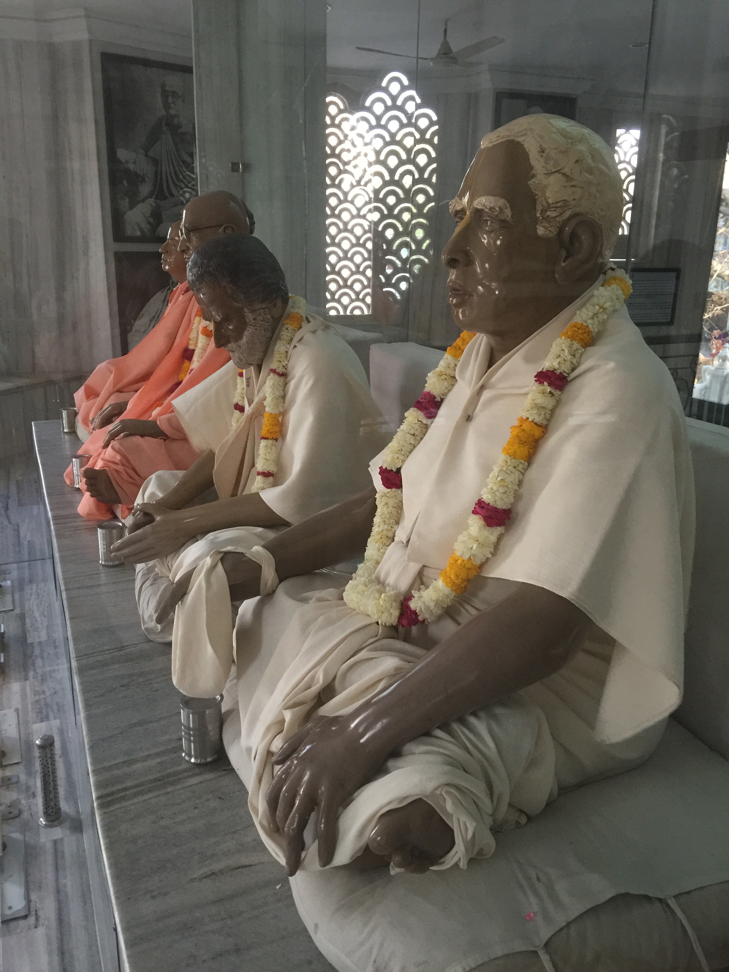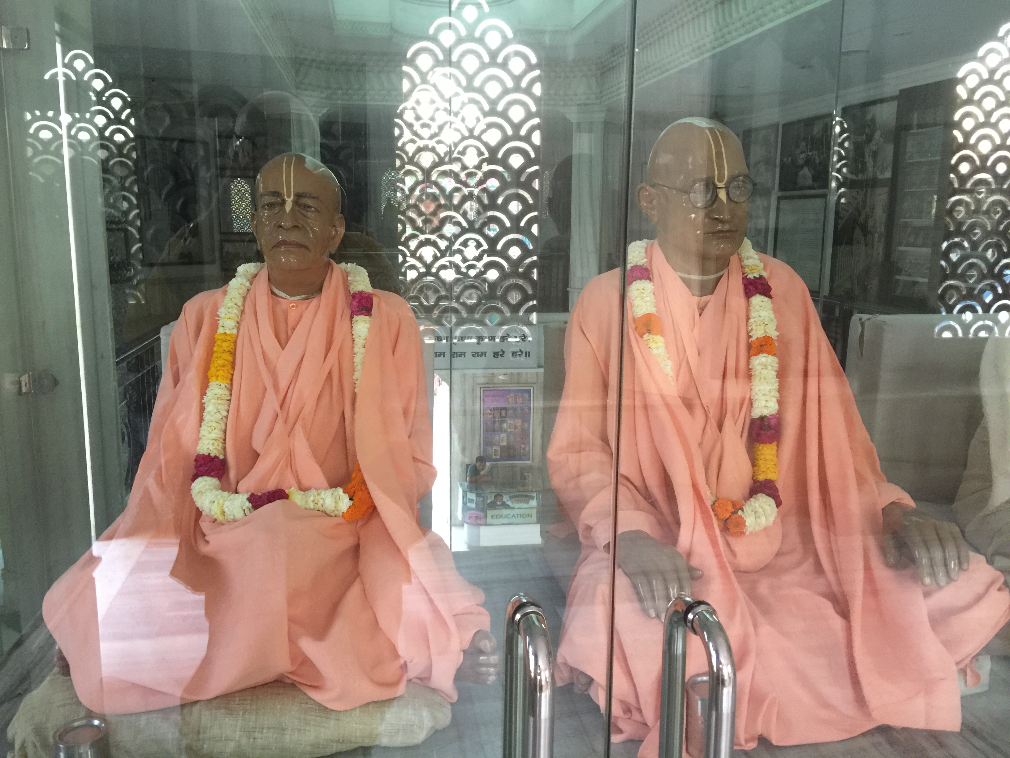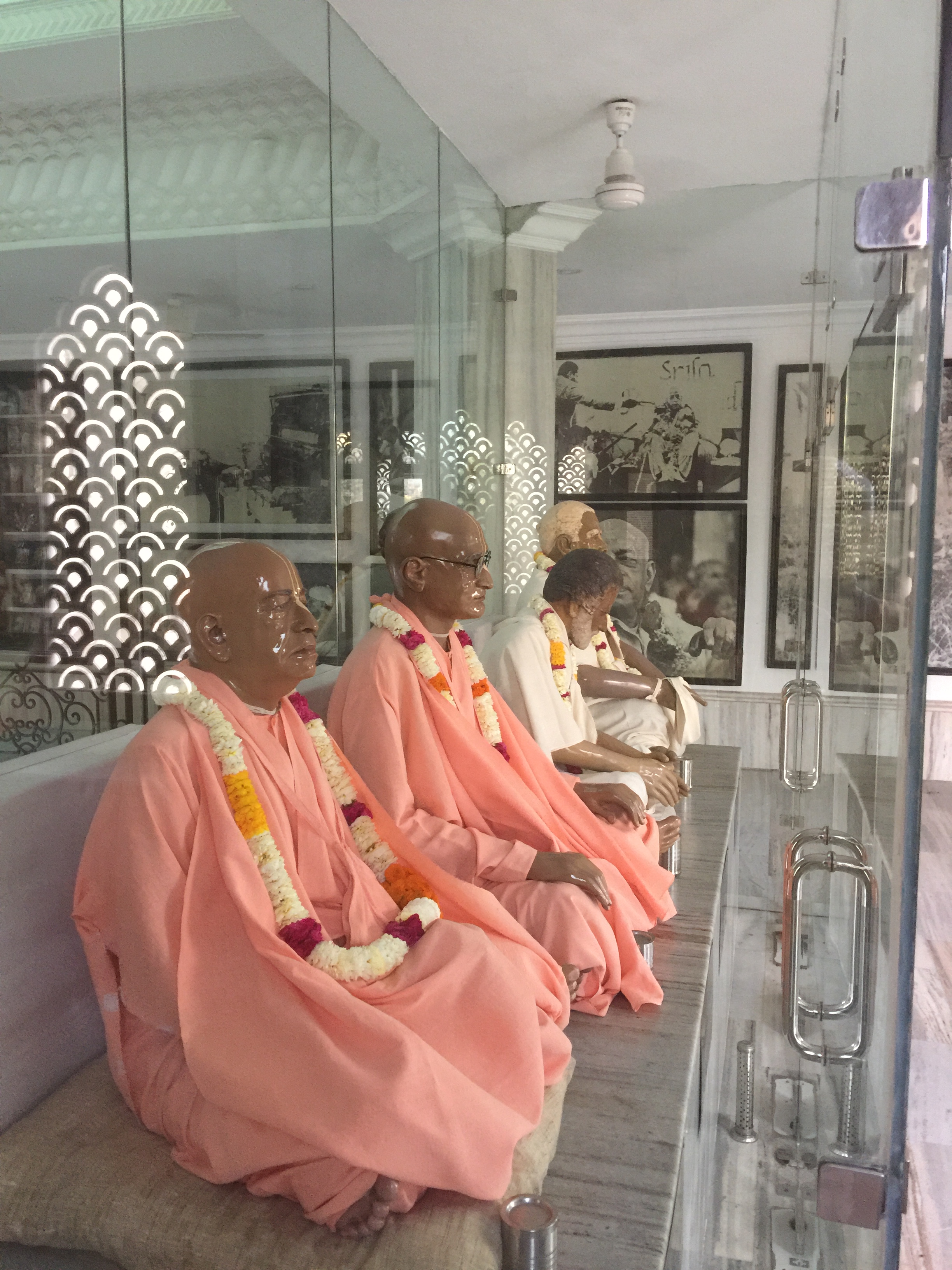 The impressive life size parampara display at ISKCON Krishna Balaram Mandir, Vrndavan, Prabhupada Samadhi structure, right side, first floor.