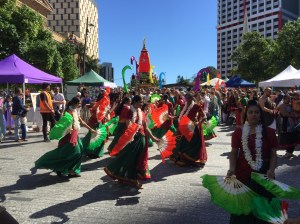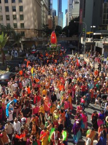 We sung our hearts out:” Jai Jagannath, Jai Jagannath, Jai Baladeva, Jai Subhadra.” or in English “All glories to Lord Jagannatha, all glories to His brother Lord Baladeva, and all glories to Their beautiful sister Subhadra.” We also sang the refrain to the Jagannath Astaka, in the sweet melodies found in the movies “Nimai of Nadia” and “Nilacala Mahaprabhu”: “Jagannaathah Swaamii nayana-patha-gaami nayana patha gaami bhavatu me.” in English language “May Lord Jagannaath be the object of my vision.” Certainly emotions were felt in relation to the Supreme Personality of Godhead, Sri Krishna. There was also a group of colourful, choreographed lady dancers in the front of the parade.