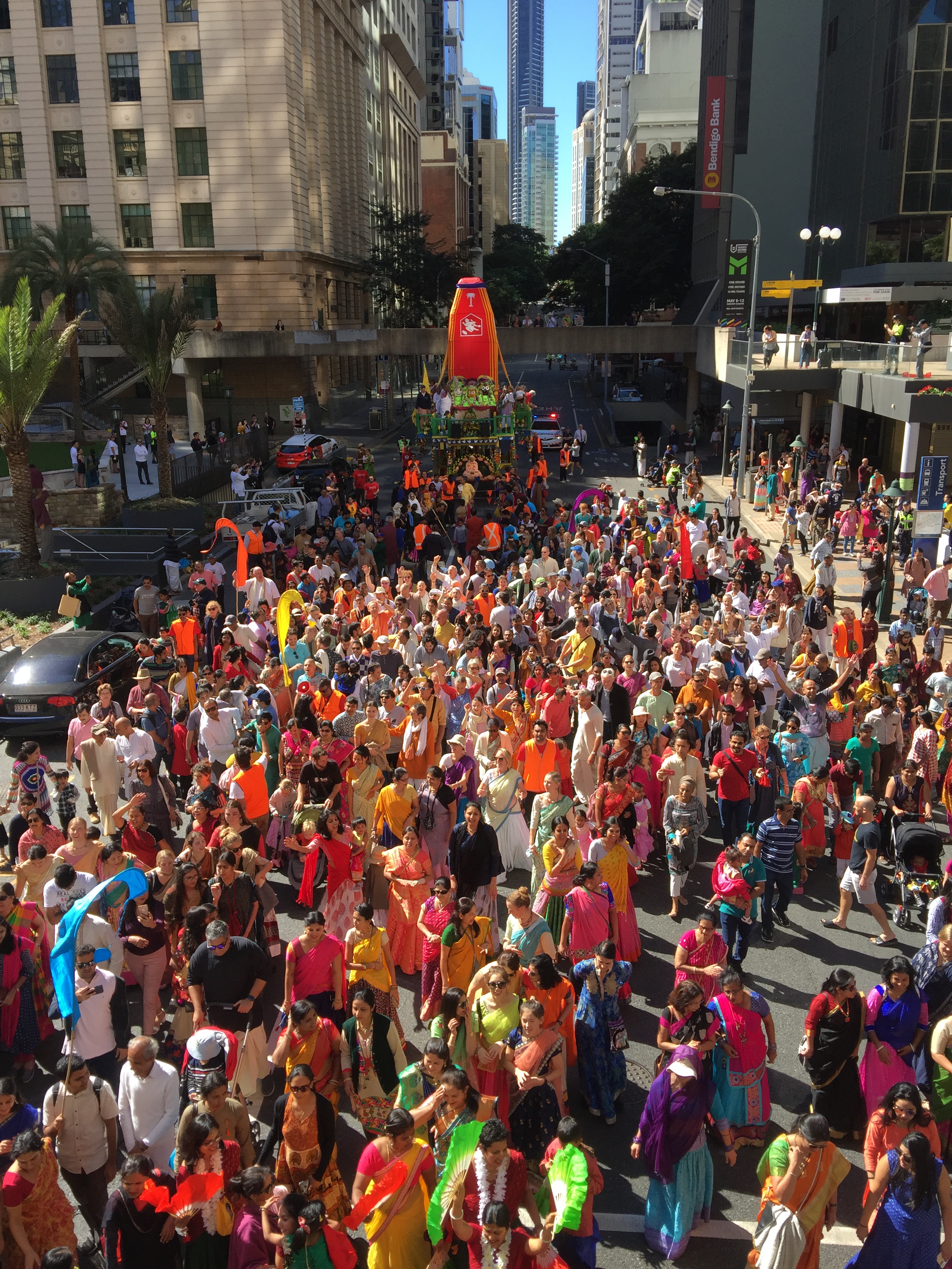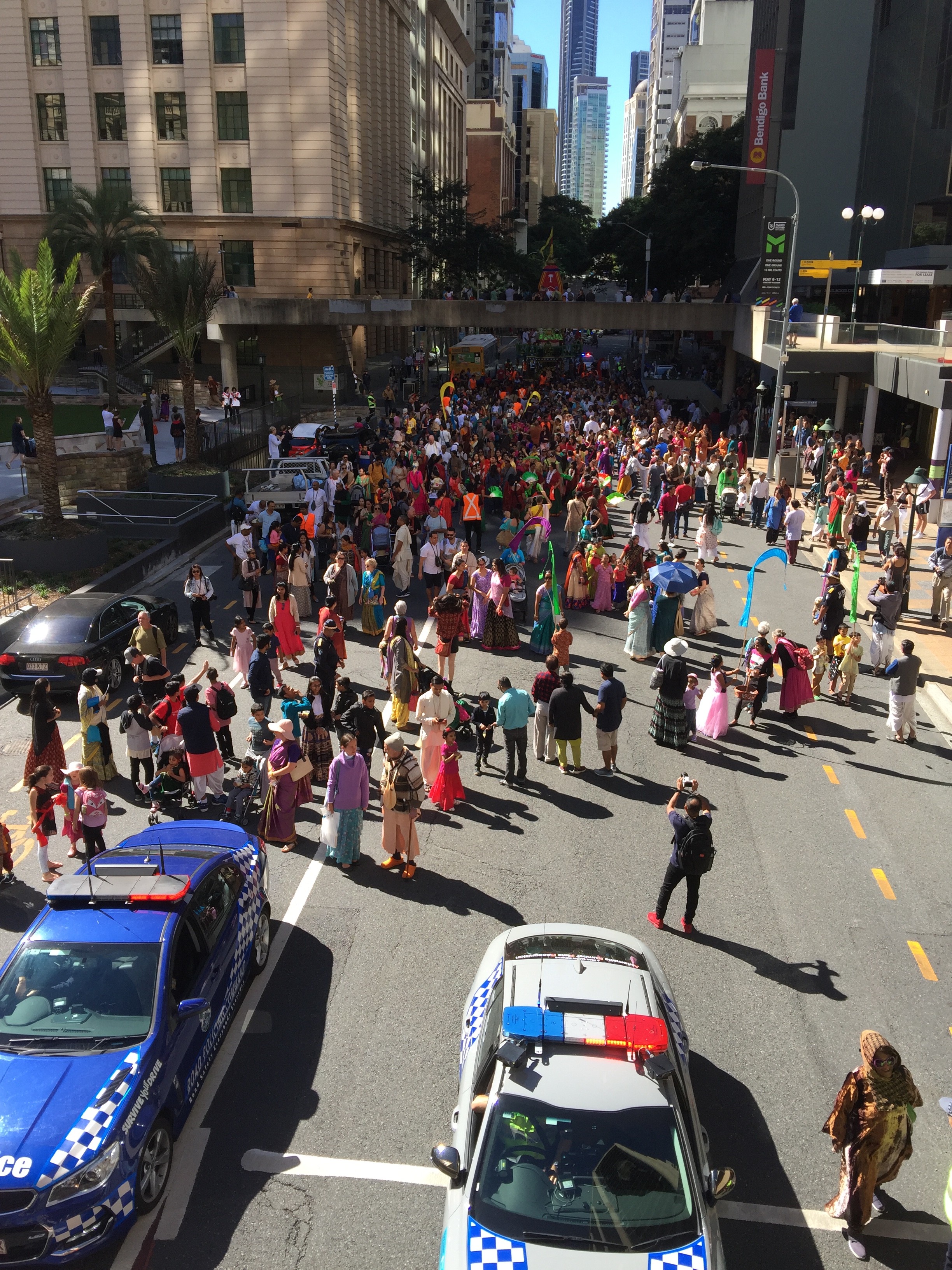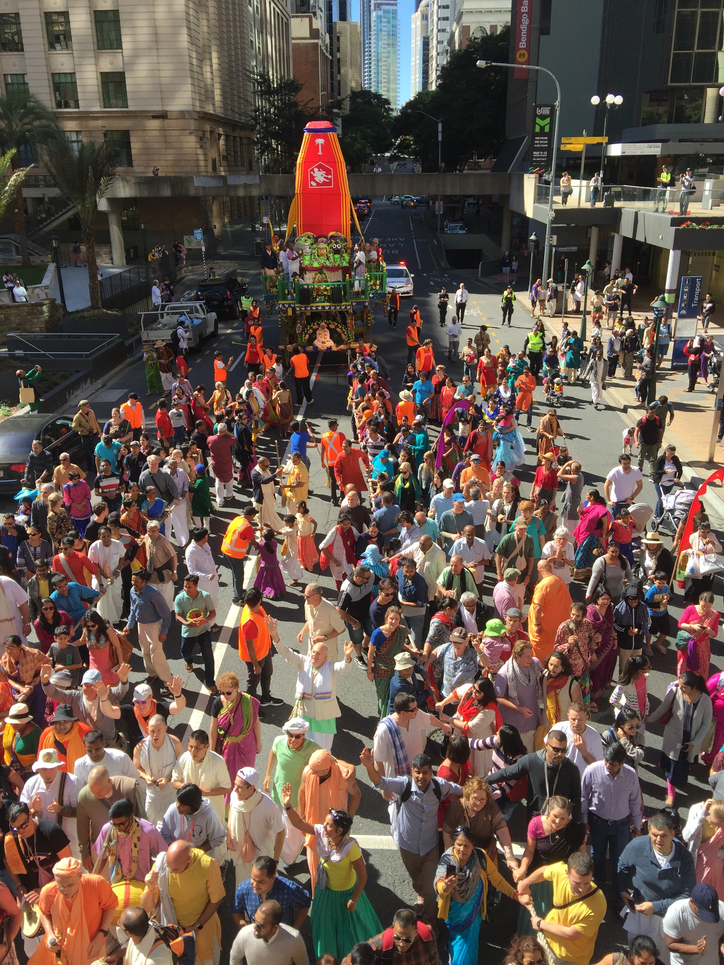 It was as if a tsunami of joy and happiness inundated the mundane-noises-filled Central Business District of Brisbane. The high pitched voice of the lead singer, His Holiness Kadamba Kanana Maharaja could be heard all over. It was well amplified. His piercing voice surely pierced the three layers of the modes of material nature in the hearts of the conditioned souls. It surely also went all the way to Goloka Vrndavan to attract the attention of Srimati Radharani. To attract the attention of Srimatee Radharanai is a sure way to attract the attention of Sri Krishna, the Supreme Personality of Godhead. And if the Supreme Personality of Godhead smiles upon us, then not only is our life successful but the whole world becomes filled with joy and happiness as well. All glories to Sri Krishna, the protector of the cows and the brahmanas !!!