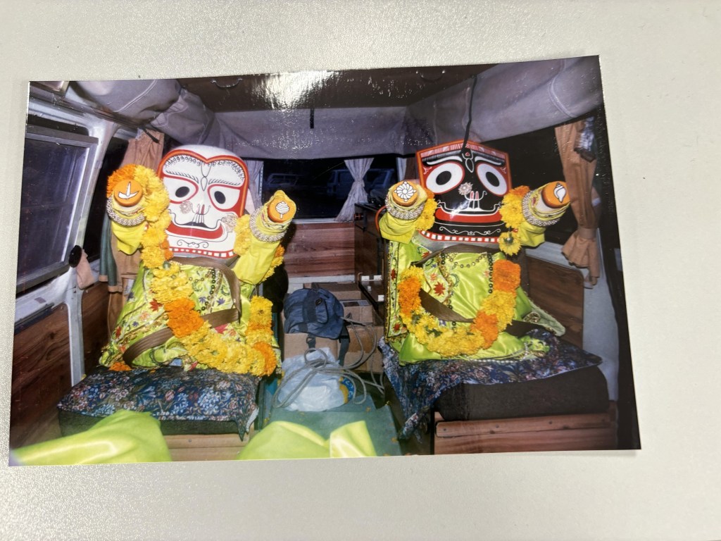 Just as the gopis were wishing strongly the return of Krishna to Vrindavan, we wish strongly the return of Lord Jaganath, Subhadra and Baladeva to the double-end-ofyear-Rathayatra in Byron Bay, New South Wales, Australia . When will that year come? It will come. But how long do we have to wait for this most important preaching event. Jai Jaganath, Jai Subhadra and Jai Baladeva. As I mentioned previously, one specific year, unfortunately I cannot say which, their Lordships travelled in my Book Distribution Samkirtan Van back and forth to parade in Byron Bay. Pictures provided. What a blessings upon this insignificant self!