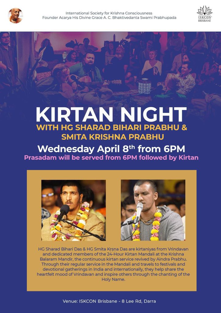 Hare Krishna Dear devotees & well-wishersThe much-awaited Krishna Cultural Festival 2025 to celebrate Janmastami is fast approaching. Featuring an amazing line up of spiritual dramas, dance & musical performances , showcasing Krishna’s pastimes ranging from when Krishna was born, to Krishna’s avatars, His love for His devotees and much more!![]() We are pleased to announce that we are celebrating Krishna Cultural Festival 2025 on:Sunday, 27th July 2025 @ Indian Community Centre (ICC), Willetton from 3 PM onwards…..If you are interested in participating, please fill the below EOIhttps://docs.google.com/forms/d/e/1FAIpQLScGu-6fh-X2fN3Jh-RhgCMr-OXs1308ACkVZLhyP8pz3aN_iA/viewform?usp=header (Last date to fill EOI – 30th May 2025)Here’s a quick video on how wonderfully we celebrated last year- https://youtu.be/knqcSVeBIgo?feature=sharedCome forward and join us in offering our best to the Supreme Personality of Godhead Lord Shri Krishna Rashi Mataji – 0406 724 285Your humble servants, Krishna Cultural Festival 2025 Organising Team ISKCON PERTH |