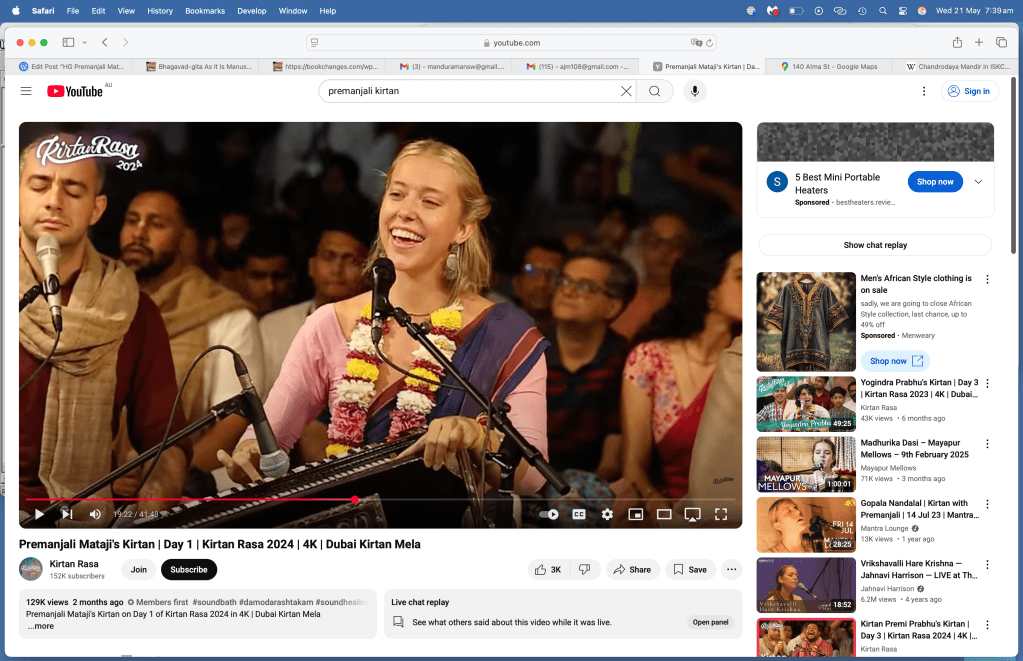 Melodious kirtan such as this by Her Grace Premanjali DD is a sure recipe for instant and enlivening happiness. Just see how happy she seems to be with a wonderful smile. Besides that, because of its spiritual nature, one never grows tired of it, as happens with material happiness neither does it sap one’s vital energy. Who would not accept to participate in such joyous occasions unless that person “is to be understood very much bewildered by the illusory energy of the Lord.”